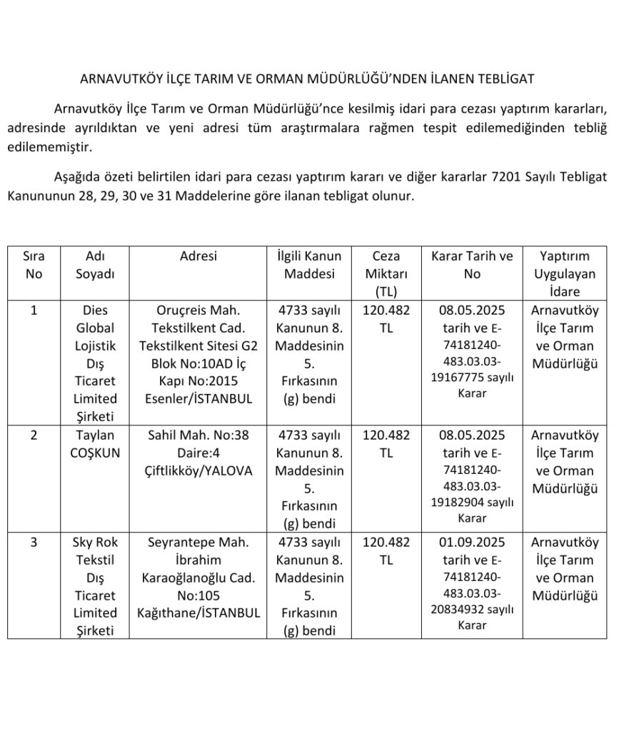 Arnavutköy İlçe Tarım ve Orman Müdürlüğü’nce kesilmiş idari para cezası yaptırım kararları, adresinde ayrıldıktan ve yeni adresi tüm araştırmalara rağmen tespit edilemediğinden tebliğ edilememiştir.